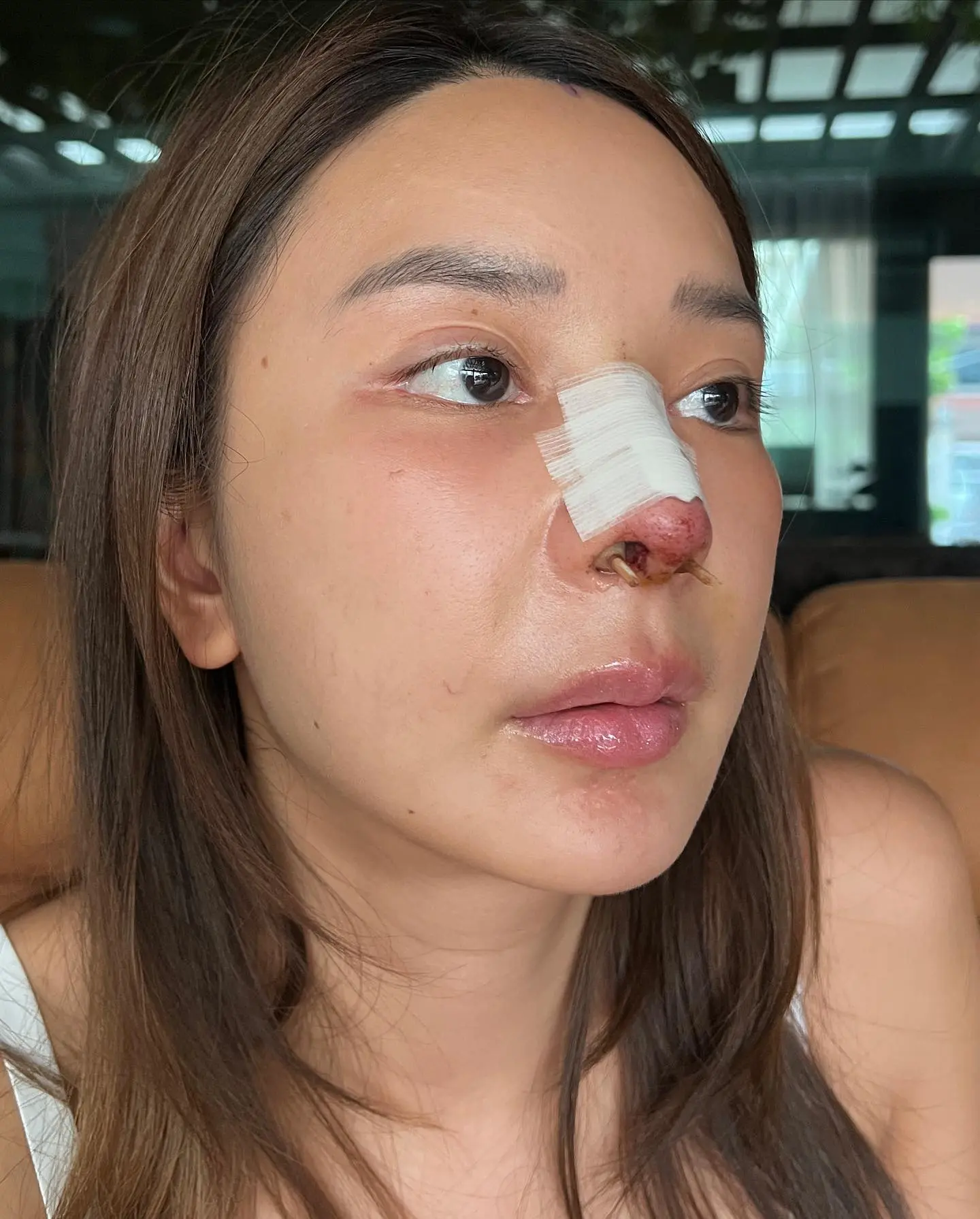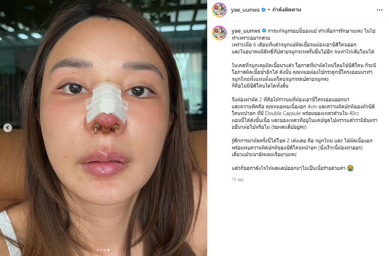 “รู้สึกการผ่าตัดครั้งนี้ได้โชค 2 เด้งเลย คือ จมูกใหม่ และได้ตัดเนื้องอก พร้อมพบความผิดปกติของซิลิโคนหน้าอก (ซึ่งเร็ว ๆ นี้ต้องผ่าออก) เดี๋ยวแย้จะมาอัปเดตเรื่อย ๆ นะคะ แล้วก็ขอกำลังใจให้ผลแล็บออกมาไม่เป็นเนื้อร้ายด้วยค่ะ”