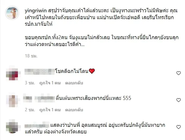 ซึ่งล่าสุดหลังจากที่ตามหาตัวมานาน ก็จังหวะพอดีกับที่แม่บ้านไปเปิดเข้ากับเจ้างูตัวร้ายในถังขยะพอดี งานนี้ทางด้านของหญิงเองก็ได้มีการ รปภ. มาช่วยกันจับงูตัวนี้ ภายหลังก็ได้รู้จากทางเน็ตว่า เป็น งูทางมะพร้าว นิสัยดุร้าย แต่ไม่มีพิษ แล้วจากที่เห็นในคลิปตัวค่อนข้างใหญ่กว่าปกติ