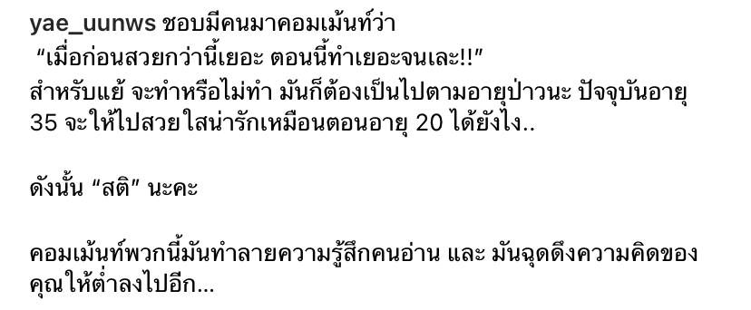 โดย หญิงแย้ บอกว่า มักจะชอบมีคนมาคอมเมนต์ว่า “เมื่อก่อนสวยกว่านี้เยอะ ตอนนี้ทำเยอะจนเละ!!” ซึ่งในมุมมองของ หญิงแย้ ไม่ว่าทำหรือไม่ได้ทำหน้ามา ยังไงก็ต้องมีการเปลื่อนแปลงไปตามอายุอยู่แล้ว ตอนนี้อายุ 35 จะให้ไปสวยใสน่ารักเหมือนตอน 20 ได้ยังไง ดังนั้นคนถามก็ตั้ง สติ! กันนิดนึง