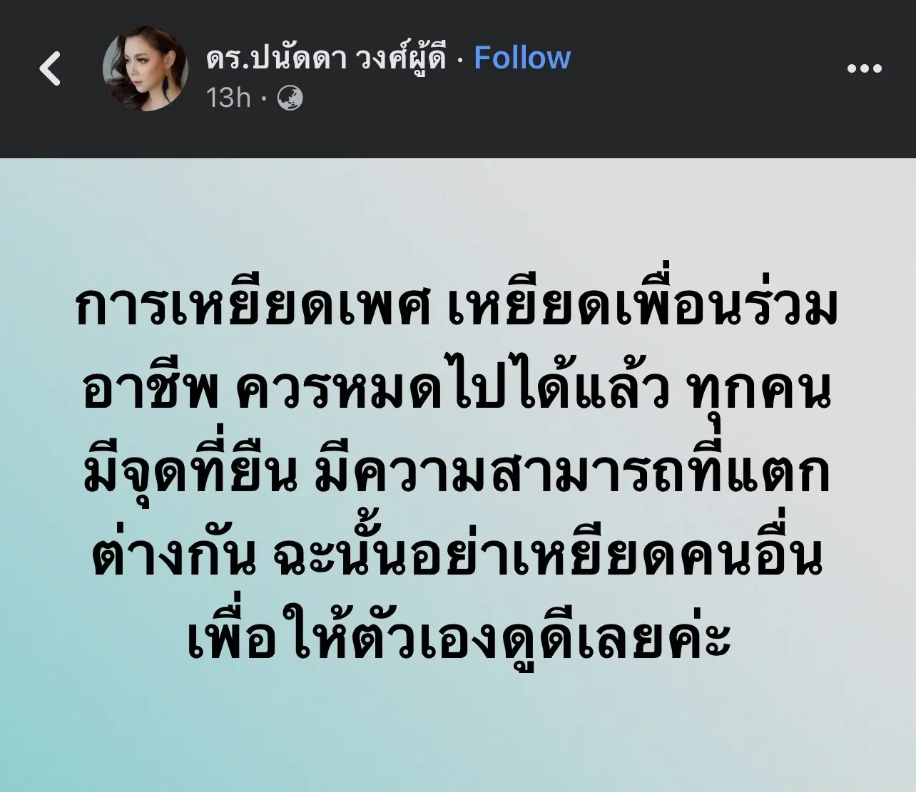 บุ๋ม ปนัดดา : การเหยียดเพศ เหยียดเพื่อนร่วมอาชีพ ควรหมดไปได้แล้ว ทุกคนมีจุดที่ยืน มีความสามารถที่แตกต่างกัน ฉะนั้นอย่าเหยียดคนอื่น เพื่อให้ตัวเองดูดีเลยค่ะ
