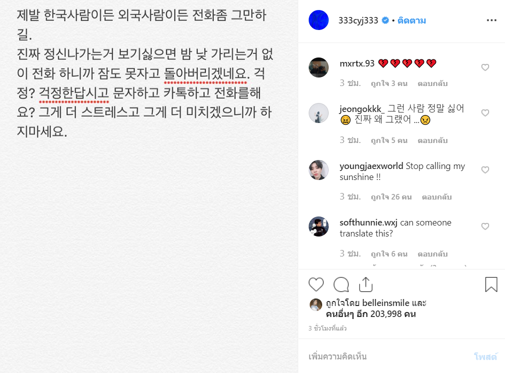 ก่อนหน้านี้ก็ทำเอาเหล่าบรรดา อากาเซ่ รู้สึกเป็นห่วงกันมามากพอแล้ว สำหรับไอดอลเกาหลีชื่อดัง ยองแจ หนึ่งในสมาชิกวง GOT7 ที่มีอาการป่วยอยู่บ่อยครั้งจนทางค่ายต้องออกมาประกาศงดงานไซน์ จึงส่งผลให้แฟนๆเป็นห่วงเรื่องสุขภาพของทุกคนในวง เพราะช่วงนี้ถือว่าเป็นช่วงที่ กัซ ทำงานกันหนักมาก ไหนจะอัลบัมใหม่ที่เพิ่งจะ Come Back ติดต่อกันถึง 2 อัลบัม ล่าสุด ยองแจ หนึ่งในสมาชิกของวง ออกมาโพสต์อินสตารแกรมเป็นภาษาเกาหลี สร้างความน่าเป็นห่วงอีกครั้งโดยมีใจความว่า “ขอร้องล่ะครับ ไม่ว่าจะเป็นคนเกาหลี คนต่างชาติ เลิกโทรมาเถอะครับ ถ้าไม่อยากเห็นอะไรที่ขาดสติจริงๆ เพราะโทรหาทั้งกลางวันกลางคืนนอนก็นอนไม่ได้ จะเป็นบ้าแล้วนะครับ เป็นห่วง ? เป็นห่วงแต่โทรหา ส่งข้อความ คาทกหรอครับ? อันนั้นจะยิ่งเครียด จะยิ่งบ้ากว่าเดิมนะครับ อย่าทำเลย” ซึ่งหลังจากที่ ยองแจ โพสต์ข้อความดังกล่าว ทำให้เหล่าบรรดาแฟนคลับต่างเข้าไปให้กำลังใจ ร่วมถึงปกป้อง และพูดขับไล่บุคคลที่มีพฤติกรรมคุกคาม ความเป็นส่วนตัวของศิลปิน