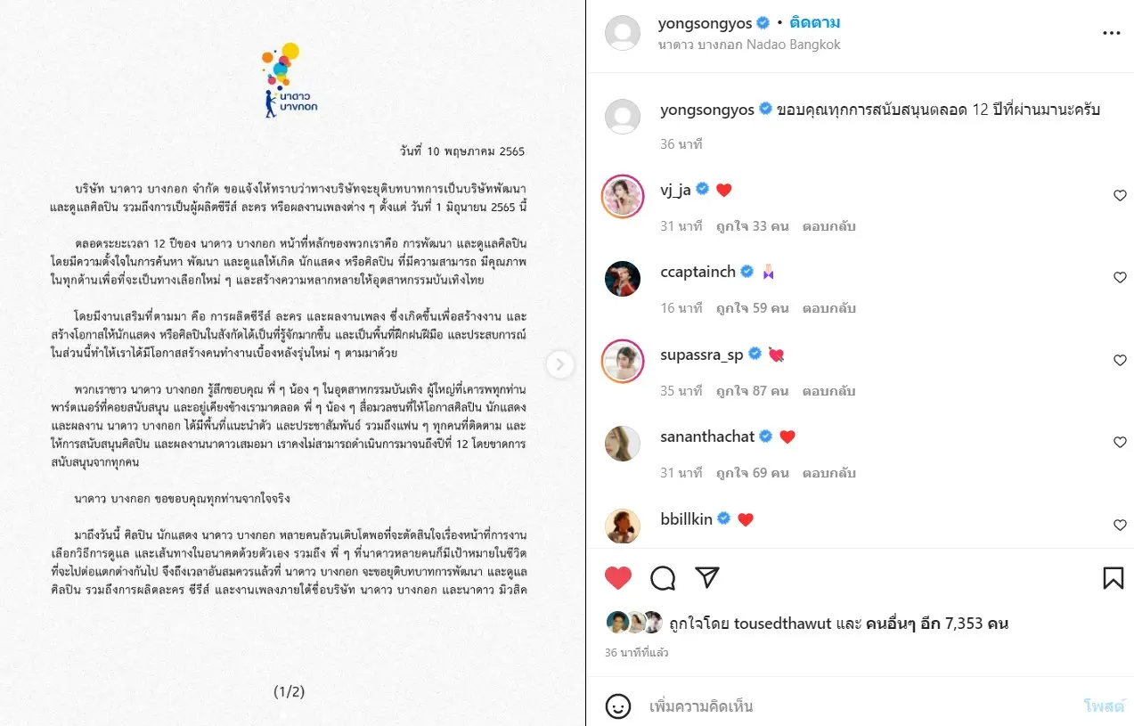 ด้าน ย้ง ทรงยศ กรรมการผู้จัดการของ นาดาว บางกอก ก็ได้มีการโพสต์ภาพจดหมายดังกล่าวพร้อมแคปชั่นว่า ขอบคุณทุกการสนับสนุนตลอด 12 ปีที่ผ่านมานะครับ ท่ามกลางคนในวงการบันเทิง และแฟน ๆ ของศิลปินในค่ายนาดาวเข้ามาร่วมส่งกำลังใจอย่างมากมาย นอกจากนี้เจ้าตัวยังได้ลบรูปโปรไฟล์อินสตราแกรมส่วนตัวออกอีกด้วย