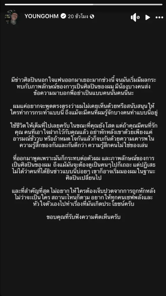 กลายเป็นกระแสร้อนในวงการบันเทิงและแวดวงดนตรีของศิลปินไทย เมื่อแร็ปเปอร์ชื่อดัง ยังโอม (YOUNGOHM) ออกมาโพสต์ข้อความแสดงจุดยืนชัดเจนผ่านทางอินสตาแกรมสตอรี่ กรณีที่ช่วงนี้มีข่าวศิลปินและนักร้องหลายคนถูกเปิดโปงว่ามีพฤติกรรมนอกใจแฟนหรือทำร้ายจิตใจคนรัก จนกลายเป็นกระแสในโลกออนไลน์