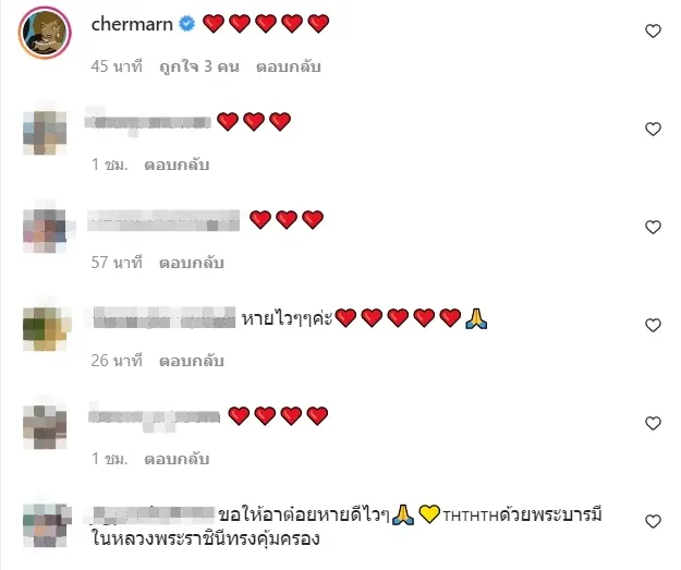 ใต้โพสต์ของ อีฟ ก็มีแฟนคลับที่คอยติดตามอาการของอาต้อย ก็เข้าร่วมแสดงความเป็นห่วง และขอให้อาต้อยนั้นมีสุขภาพที่แข็งแรงขึ้นในเร็ววัน