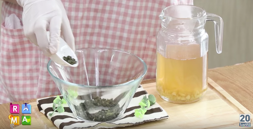 3. ใส่ชาเซ็นฉะลงในป้านชา ตามด้วยน้ำขิงที่ต้ม แช่ไว้ประมาณ 3-5 นาที จนใบชาคลายตัว