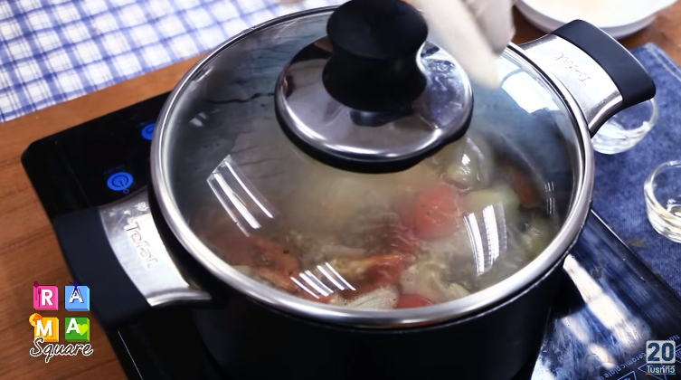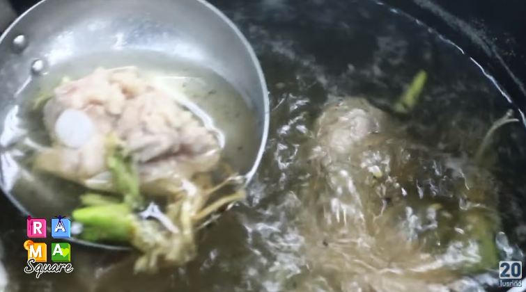 แก่นตะวันปอกเปลือกหั่นเป็นท่อนประมาณ 2 นิ้ว กระดูกหมูอ่อน 1 ขีด หอมใหญ่(หั่นตามยาว) 1 หัว มะเขือเทศ(หั่นตามยาว 3-4 ชิ้นต่อลูก) 5-6 ลูก ผักชีใบ 1 ต้น รากผักชี 2 ราก พริกไทย 10-15 เม็ด เกลือป่น 2 ช้อนชา ซีอิ้วขาว 2 ช้อนชา น้ำเปล่า 5 ถ้วย