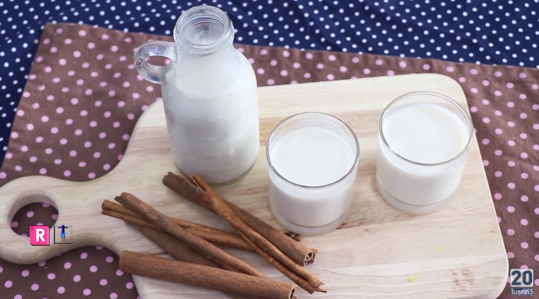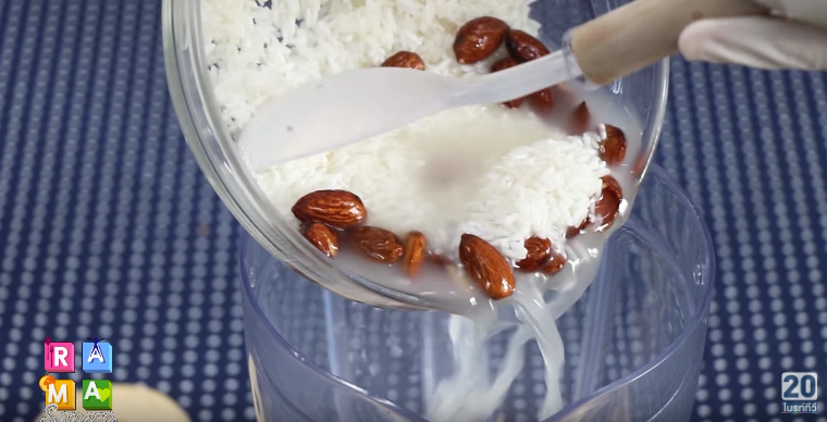 นำข้าวออกจากตู้เย็น นำอบเชยออกแล้วเทลงเครื่องปั่น ปั่นจนส่วนผสมละเอียด