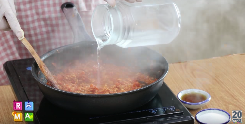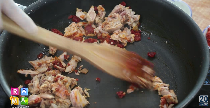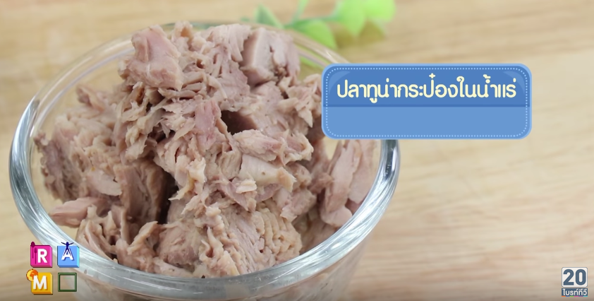 2. ใส่ปลาทูน่าลงไปผัด ยีให้เป็นชิ้นเล็ก ๆ ผัดให้เข้ากัน