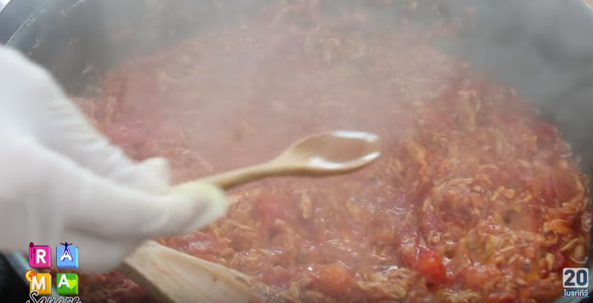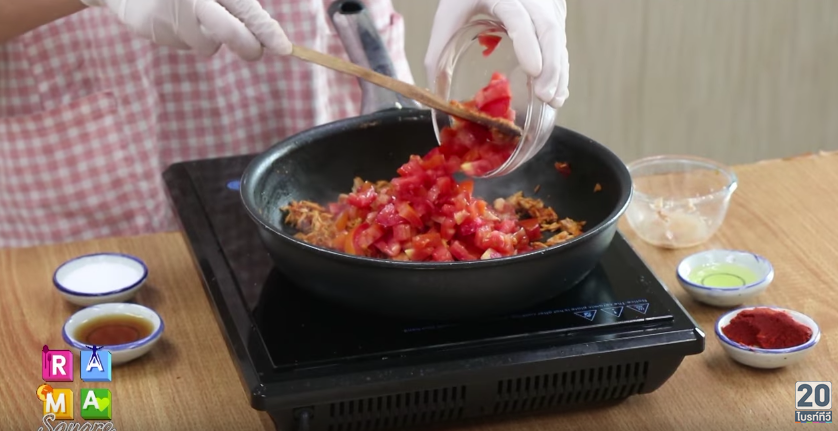 3. ใส่มะเขือเทศลงผัดให้มะเขือเทศสุกนุ่ม ชอบขลุกขลิกเติมน้ำได้เล็กน้อย