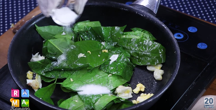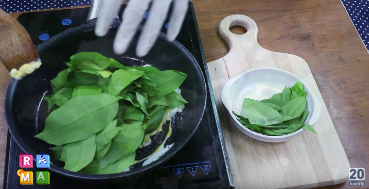 ตามด้วยไข่ตอกลงไปผัดๆ ใส่ผักใบเหลียงลงไป