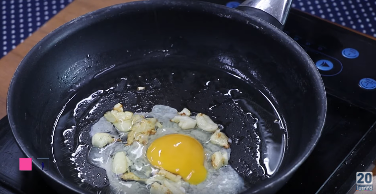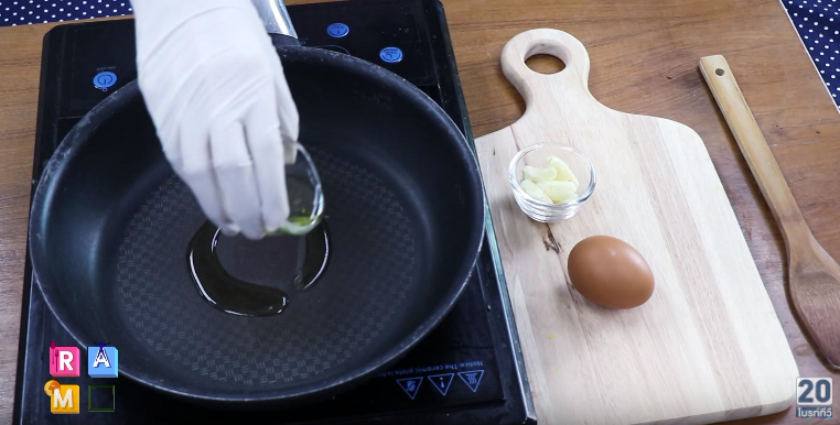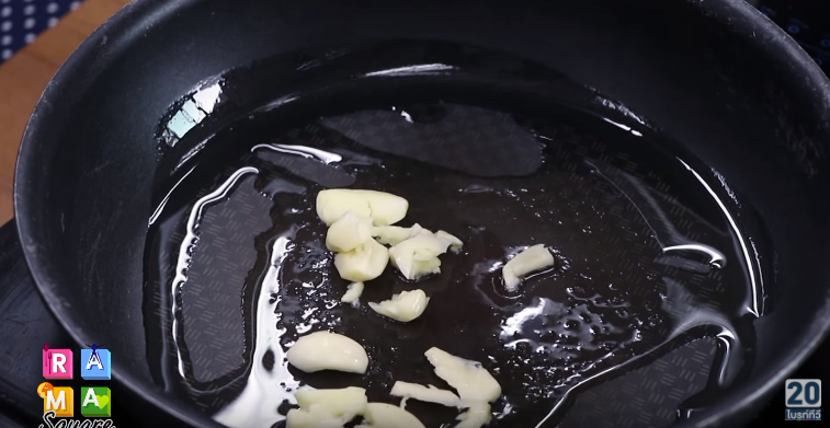 ตั้งกะทะรอร้อน ใส่กระเทียมลงไปผัดหอมๆ