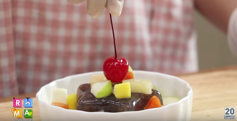 5. เมื่อจะรับประทานจัดวุ้นสำรองใส่ภาชนะ ใส่ฟรุ๊ตค็อกเทลกระป๋องและเชอร์รี่แดง เติมน้ำแข็ง พร้อมรับประทาน