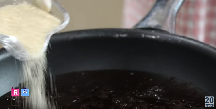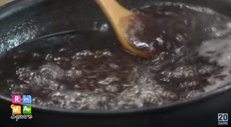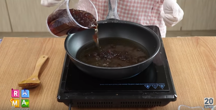 3. ใส่น้ำสำรอง น้ำตาลทรายแดงและผงวุ้นสำหรับทำขนมขึ้นตั้งไฟจนเดือด เทลงพิมพ์ที่เตรียมไว้
