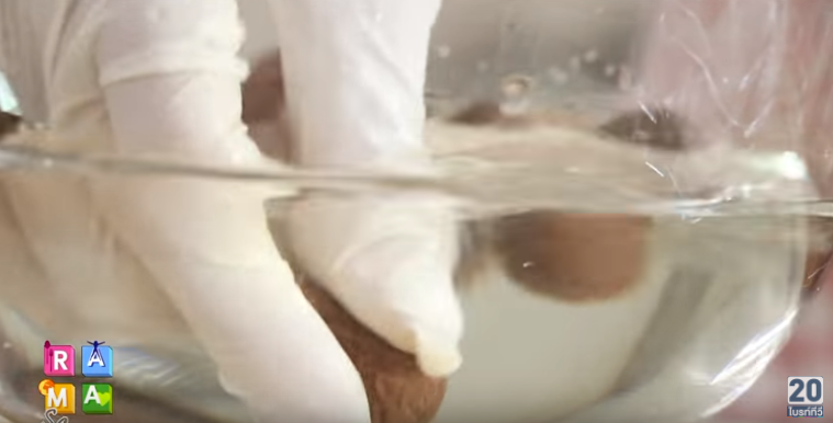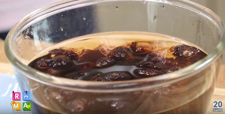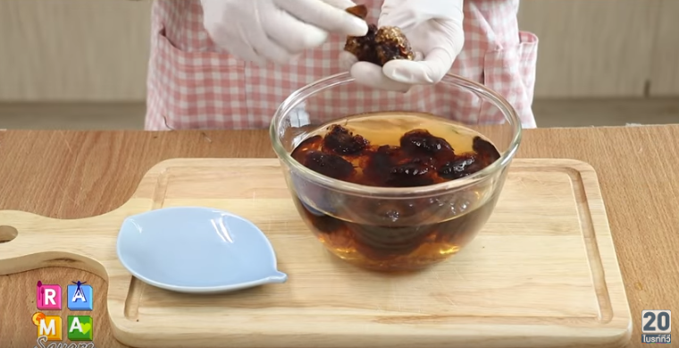 1. ล้างลูกสำรองให้สะอาด ตัดหัว แช่ทิ้งไว้ในน้ำอุ่นจนพองตัวเป็นวุ้น จากนั้นลอกเปลือกออกจนหมด