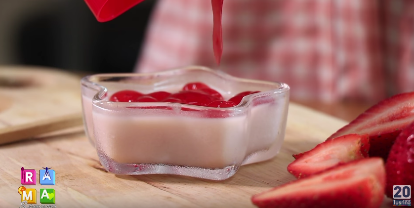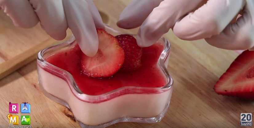 4. ก่อนเสิร์ฟให้เคาะพุดดิ้งลงในจาน ราดด้วยซอสสตรอว์เบอร์รี แต่งด้วยสตรอว์เบอร์รีสด