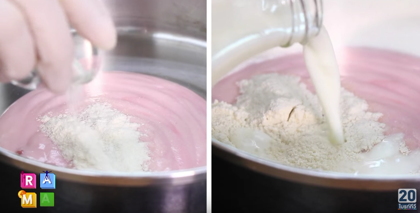 2. นำออกจากเตา ใส่น้ำตาลทรายลงไปคนผสมให้ผงวุ้นและน้ำตาลทรายละลายหมด