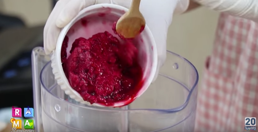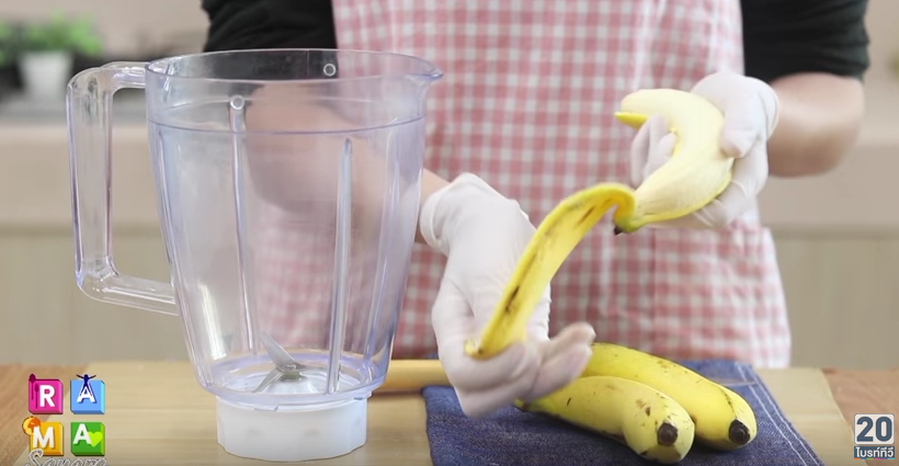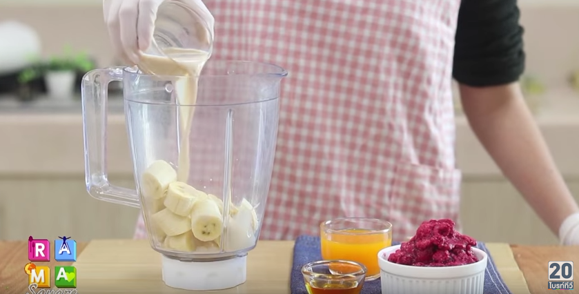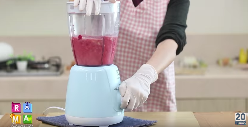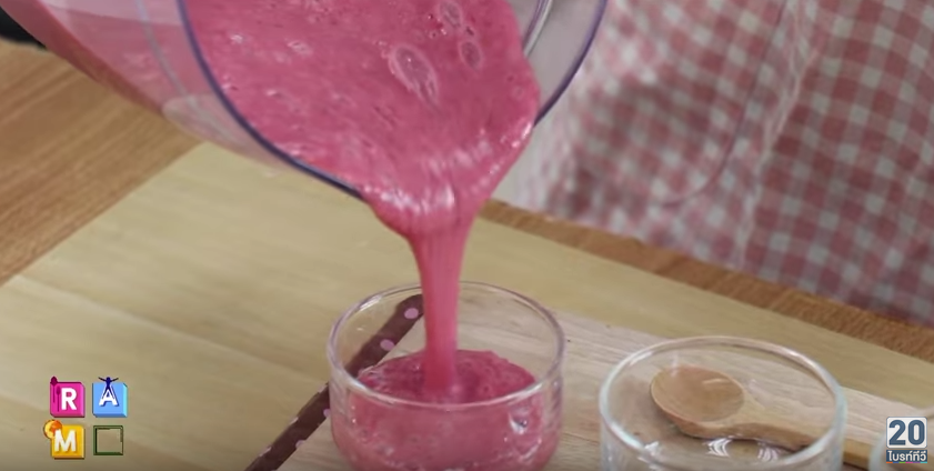 นำส่วนผสมทุกอย่างใส่ลงในเครื่องปั่น ปั่นจนเนียนละเอียด เทใส่แก้ว
