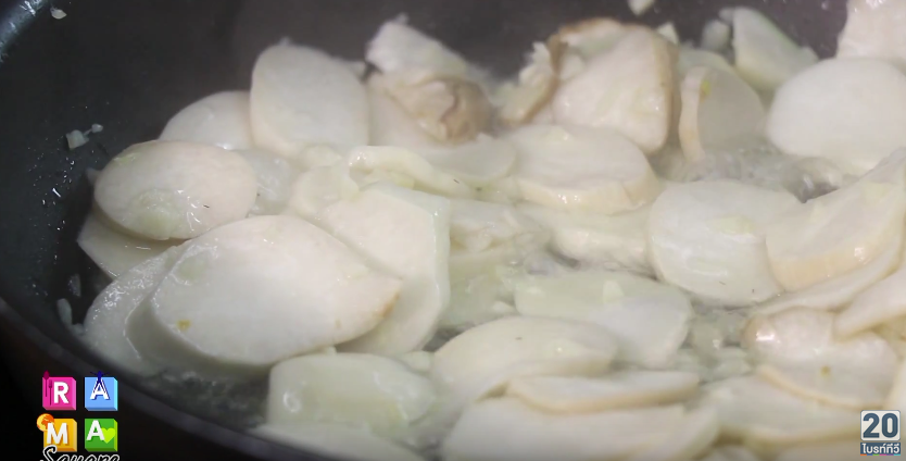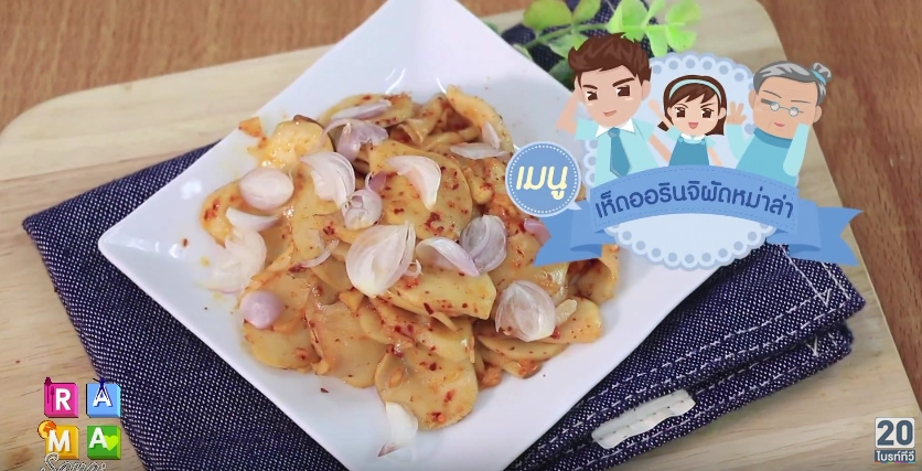 1. ตั้งกะทะใส่น้ำมัน เอากระเทียมลงผัดตามด้วยเห็ด