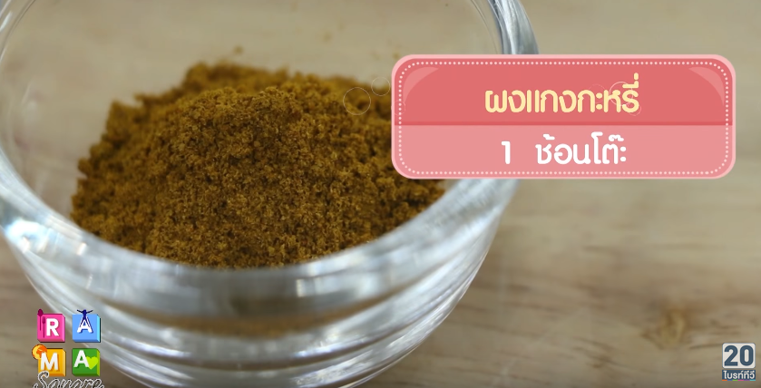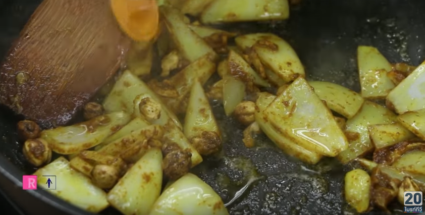 ใส่เครื่องแกงกะหรี่ลงผัด ใส่หอมใหญ่ ผัดทุกอย่างให้ขลุกขลิก แล้วใส่น้ำส้มสายชู