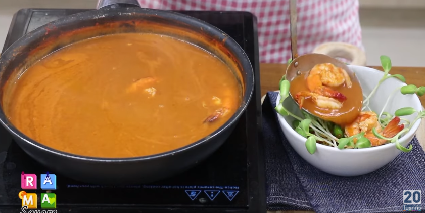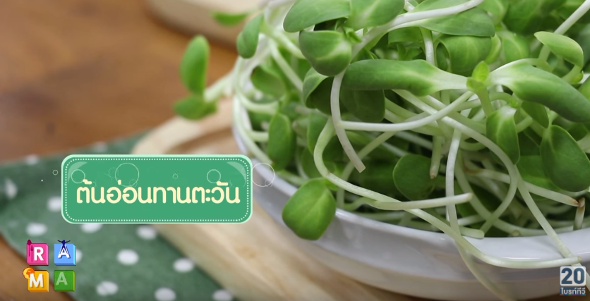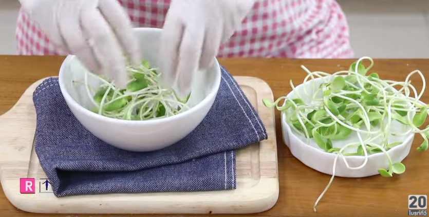 3. ใส่ต้นอ่อนทานตะวันสดวางรองลงในถ้วย แล้วตักราดด้วยน้ำแกงส้มที่ปรุงไว้