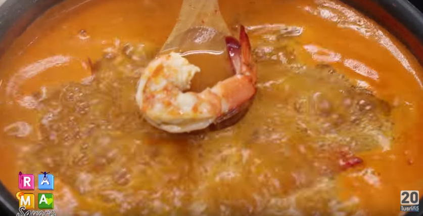 2. นำน้ำซุปไก่ขึ้นตั้งไฟให้เดือด เติมน้ำพริกแกงส้มที่ปั่นไว้ลงไปคนให้น้ำพริกแกงละลาย ปรุงรสด้วยน้ำตาลปี๊บ น้ำปลา เกลือ และน้ำมะขามเปียก ต้มประมาณ 5 นาที แล้วค่อยใส่กุ้งลงต้มต่อจนเดือด