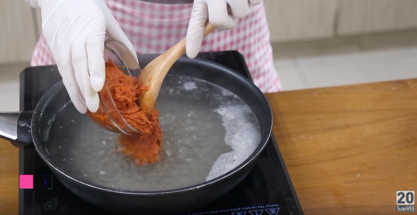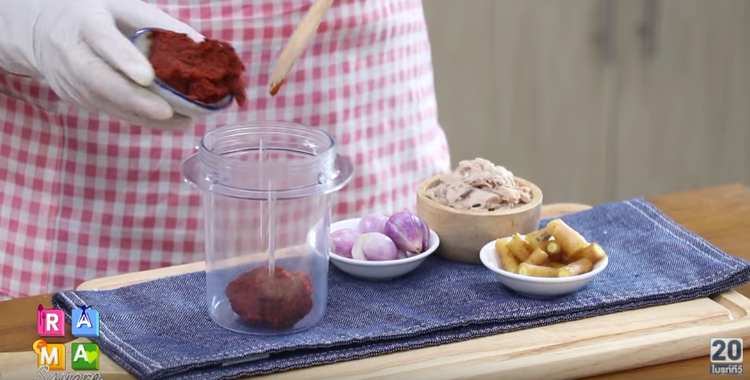 1. นำน้ำพริกแกงส้ม กระชาย หอมแดง และเนื้อปลาทูน่ามาปั่นรวมกัน (ที่เลือกใช้ทูน่าเพราะสะดวกและความมันน้อย) ปั่นจนเนียนละเอียด