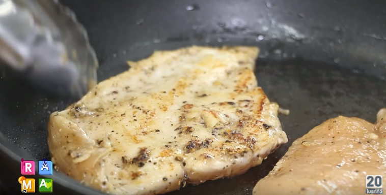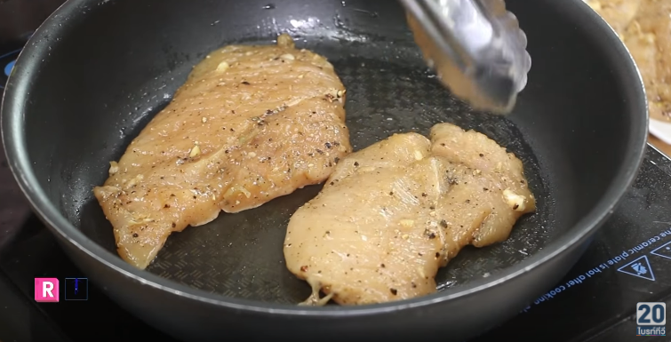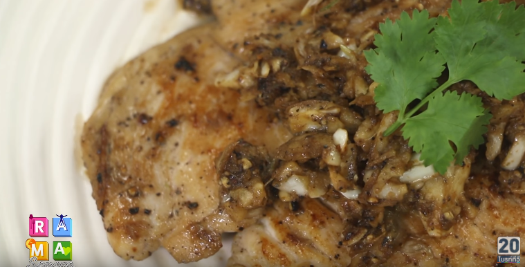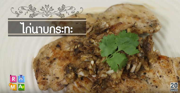 ใส่กระเทียมพริกไทย รากผักชี ที่โขลกละเอียดแล้วก่อนที่จะเอามาลงกระทะใช้มีดสับชิ้นไก่เบาๆเพื่อให้แบนนำไปกดนาบบนกระทะที่ใส่น้ำมันเล็กน้อย นำกระเทียม พริกไทย รากผักชีที่โขลกแล้วคั่ว แล้วโรยหน้าไก่ที่นาบกระทะ พร้อมเสริฟ์