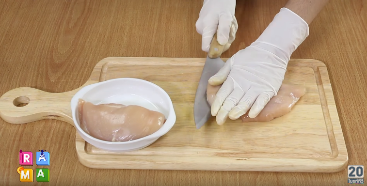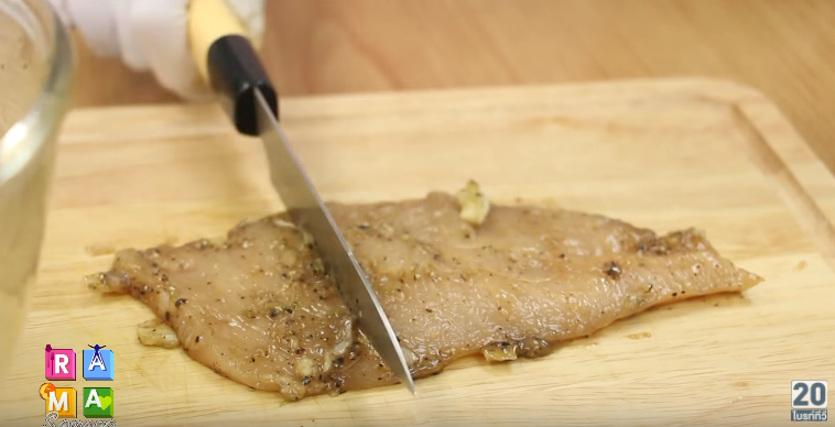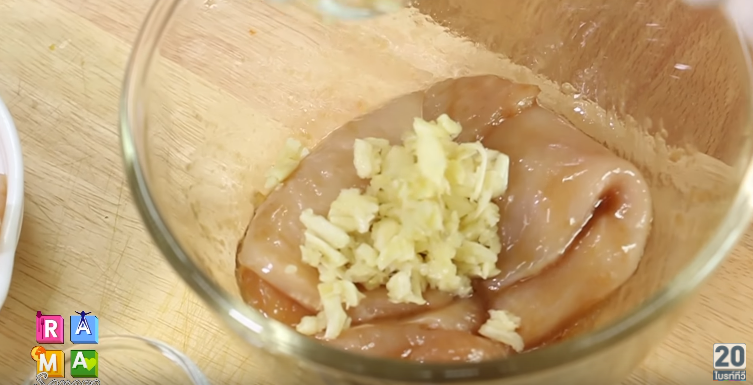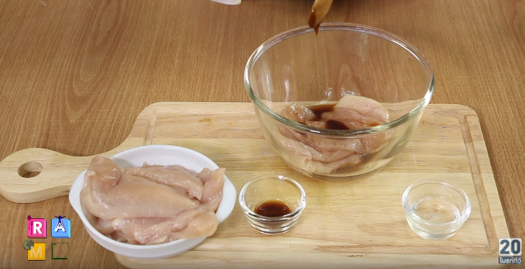 หั่นไก่บางๆ เป็นชิ้นยาวๆ ประมาณ 3 นิ้ว ใส่ซีอิ้วขาวผสมน้ำมันหอยครึ่งช้อนโต๊ะ ใส่น้ำมัน 1 ช้อนโต๊ะ ขยำให้เข้าเนื้อทั้วกัน