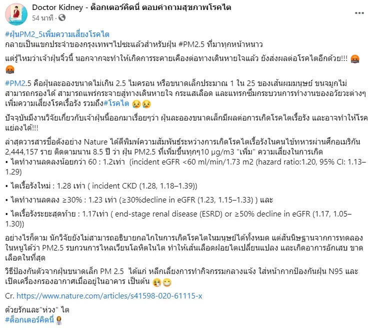 ล่าสุด (17 ธ.ค. 63) เฟซบุ๊กเพจ Doctor Kidney – ด็อกเตอร์คิดนี่ ตอบคำถามสุขภาพโรคไต ได้ออกมาโพสเกี่ยวกับการที่ฝุ่น PM2.5 ที่สามารถส่งผลต่อไตได้ว่า ปัจจุบันมีงานวิจัยเกี่ยวกับฝุ่น PM2.5 ว่ามีผลต่อการเกิดโรคไตเรื้อรัง และอาจทำให้โรคแย่ลงได้