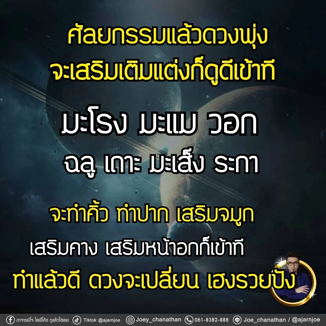 อาจารย์โจ ไลฟ์โค้ช เผย ดวง 7 ปีนักษัตร เสริม เติม แต่ง ศัลยกรรมแล้วปัง โดยได้โพสต์ผ่านแฟนเพจ อาจารย์โจ ไลฟ์โค้ช ดูแล้วใช่เลย