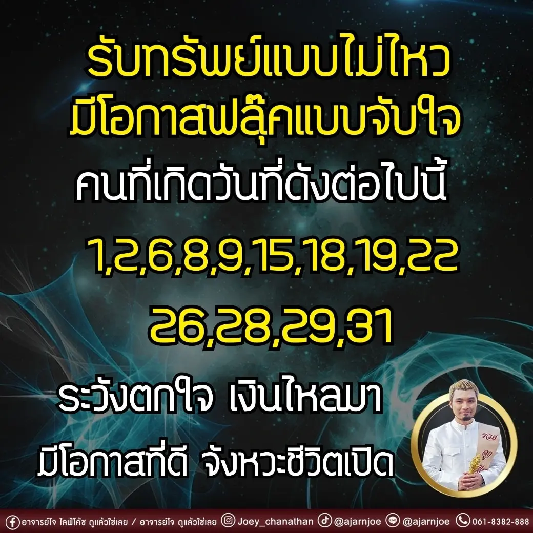 อาจารย์โจ ไลฟ์โค้ช เผย ผู้ที่เกิดในวันต่อไปนี้ ดวงรับทรัพย์ เป็นช่วงเวลาที่ดีของชีวิต โดยได้โพสต์ผ่านแฟนเพจ อาจารย์โจ ไลฟ์โค้ช ดูแล้วใช่เลย