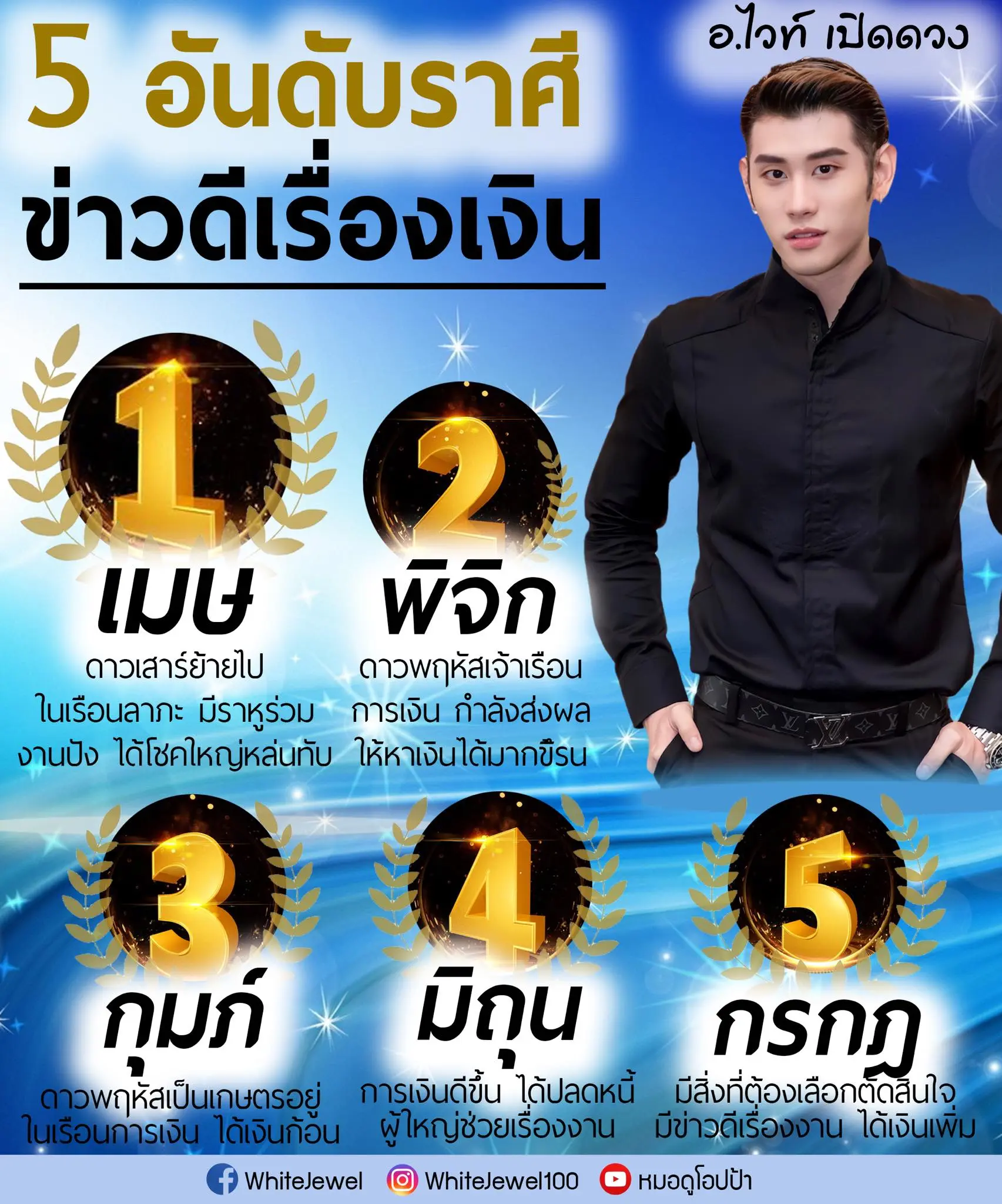 อาจารย์ไวท์ เปิดดวง หมอดูโอปป้า เผย จัดอันดับ 5 ราศี มีข่าวดีเรื่องเงิน การเงินดี มีทรัพย์ ปังสะบัด โดยได้โพสต์ผ่านแฟนเพจ White Jewel