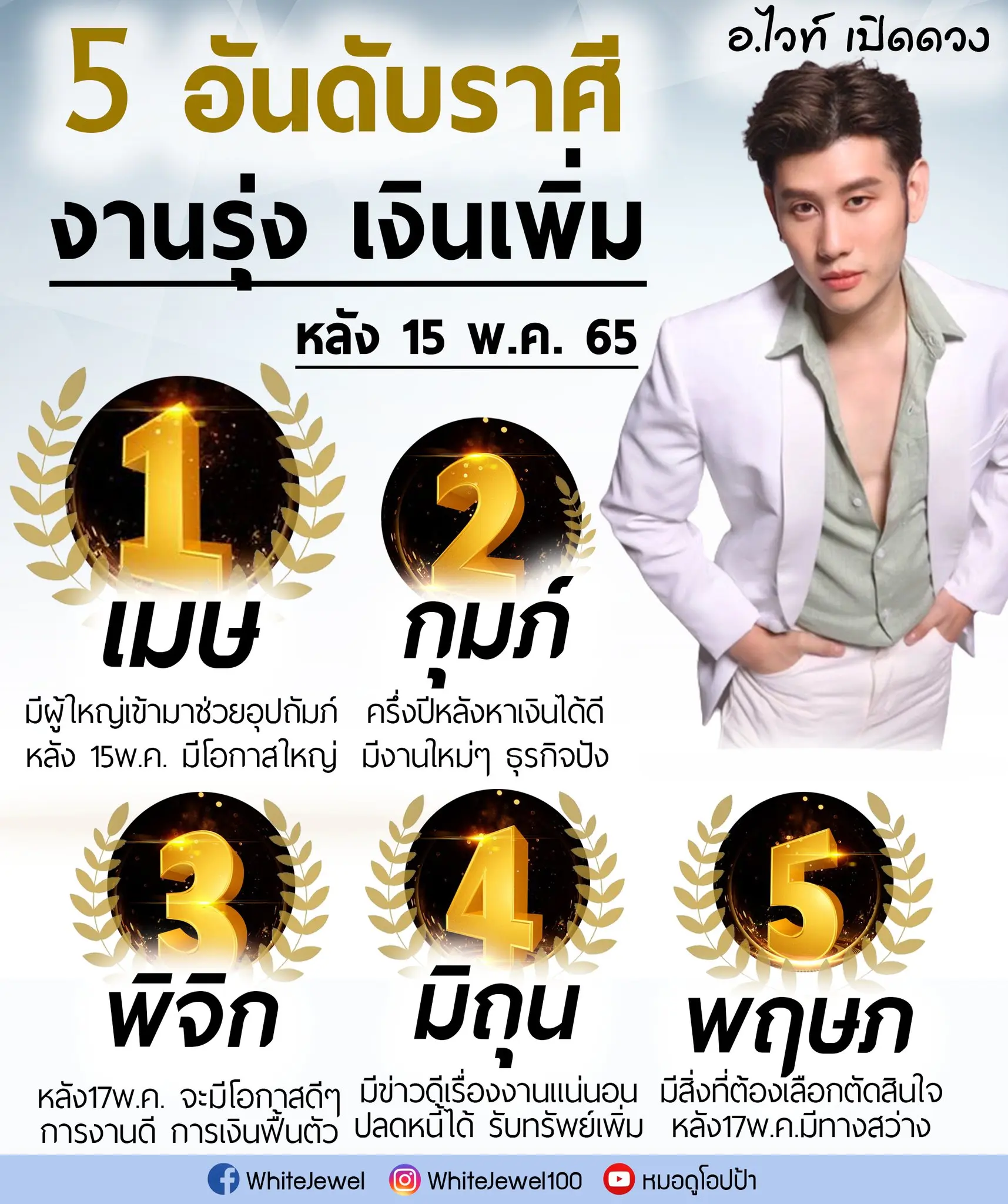 อาจารย์ไวท์ เปิดดวง หมอดูโอปป้า เผย ดวง 5 ราศี งานรุ่ง เงินเพิ่ม ในช่วงหลังวันที่ 15 พฤษภาคม 2565 โดยได้โพสต์ผ่านแฟนเพจ White Jewel