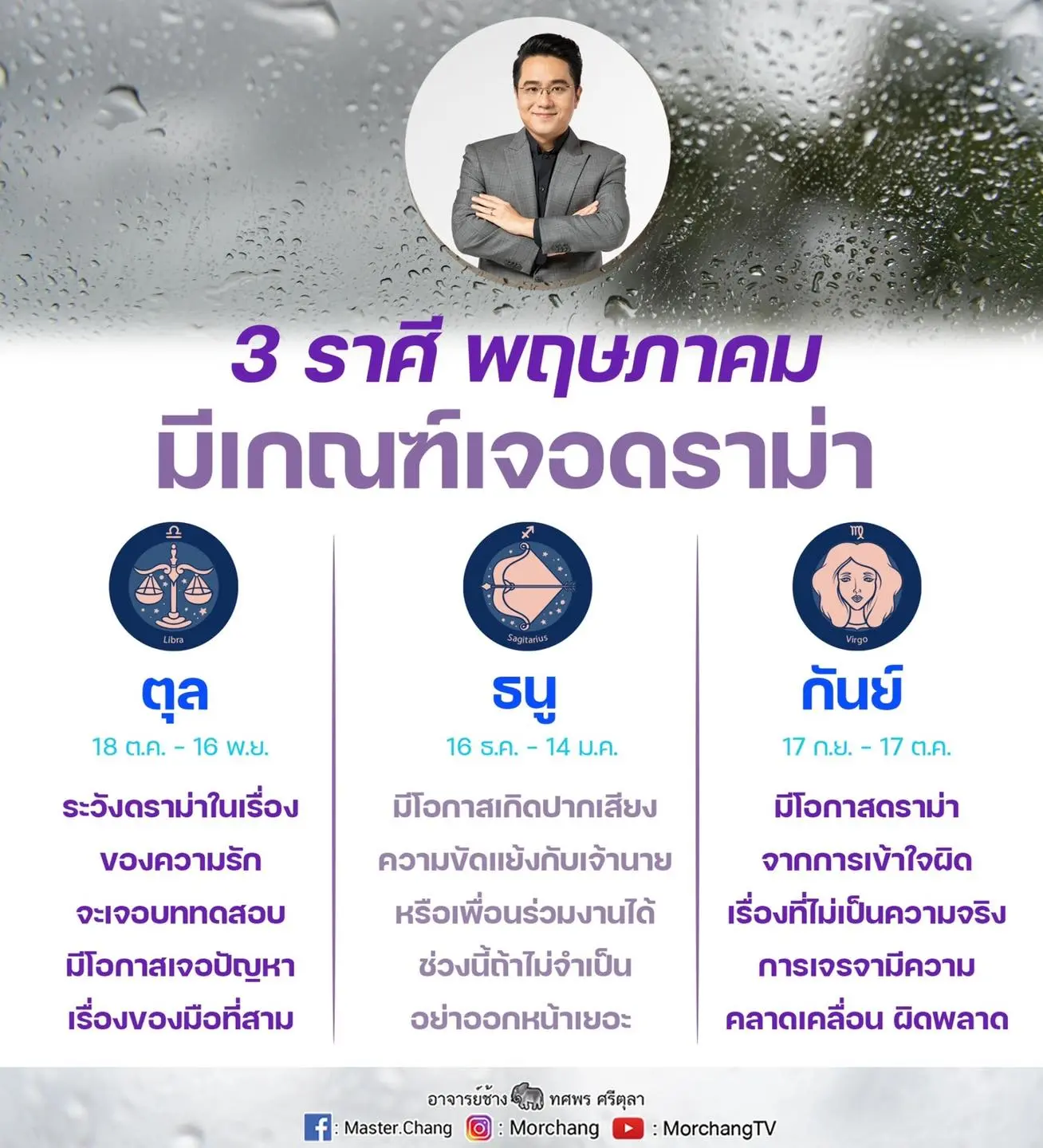 หมอช้าง ทศพร ศรีตุลา เผย 3 ราศี เดือนพฤษภาคม มีเกณฑ์เจอเรื่องดราม่า โดยได้เผยผ่านทางแฟนเพจ หมอช้าง ทศพร ศรีตุลา