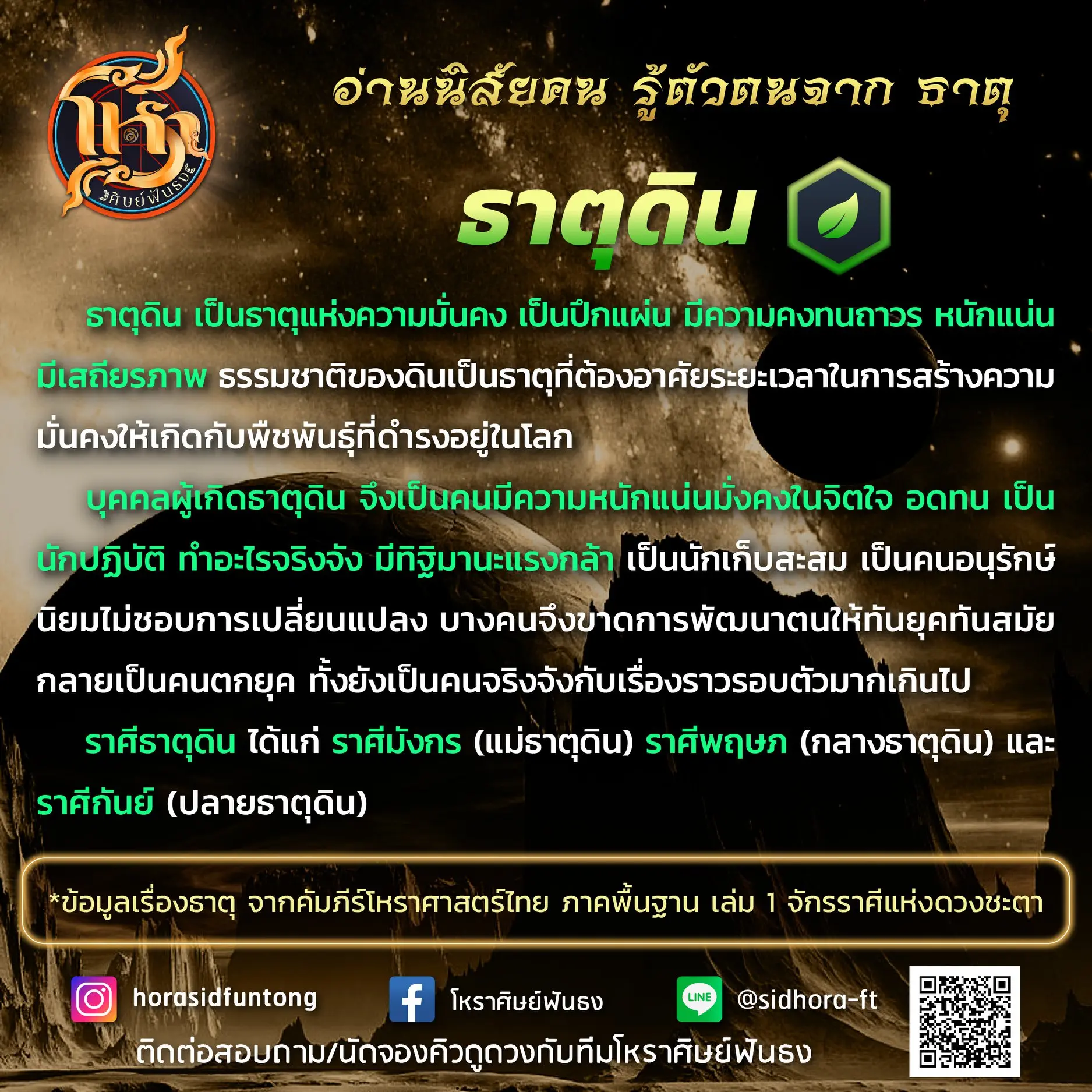เพจโหราศิษย์ฟันธง ได้โพสต์ภาพและข้อความถึงคำทำนายนิสัยจาก ธาตุดิน ว่า “ในการศึกษาวิชาโหราศาสตร์ หัวข้อหนึ่งที่เราได้ศึกษา คือธาตุประจำราศี ธาตุต่าง ๆ ย่อมมีลักษณะเด่น มีคุณลักษณะที่แตกต่างกันไป ดังนั้นบุคคลผู้เกิดในลัคนา/ราศีต่าง ๆ กัน มีธาตุต่างกัน ย่อมมีลักษณะนิสัยที่ต่างกันตามธาตุด้วยค่ะ เช้านี้เรามาเรียนรู้นิสัยของคนจากธาตุกันค่ะ เริ่มที่ธาตุดินกันเลยค่ะ”