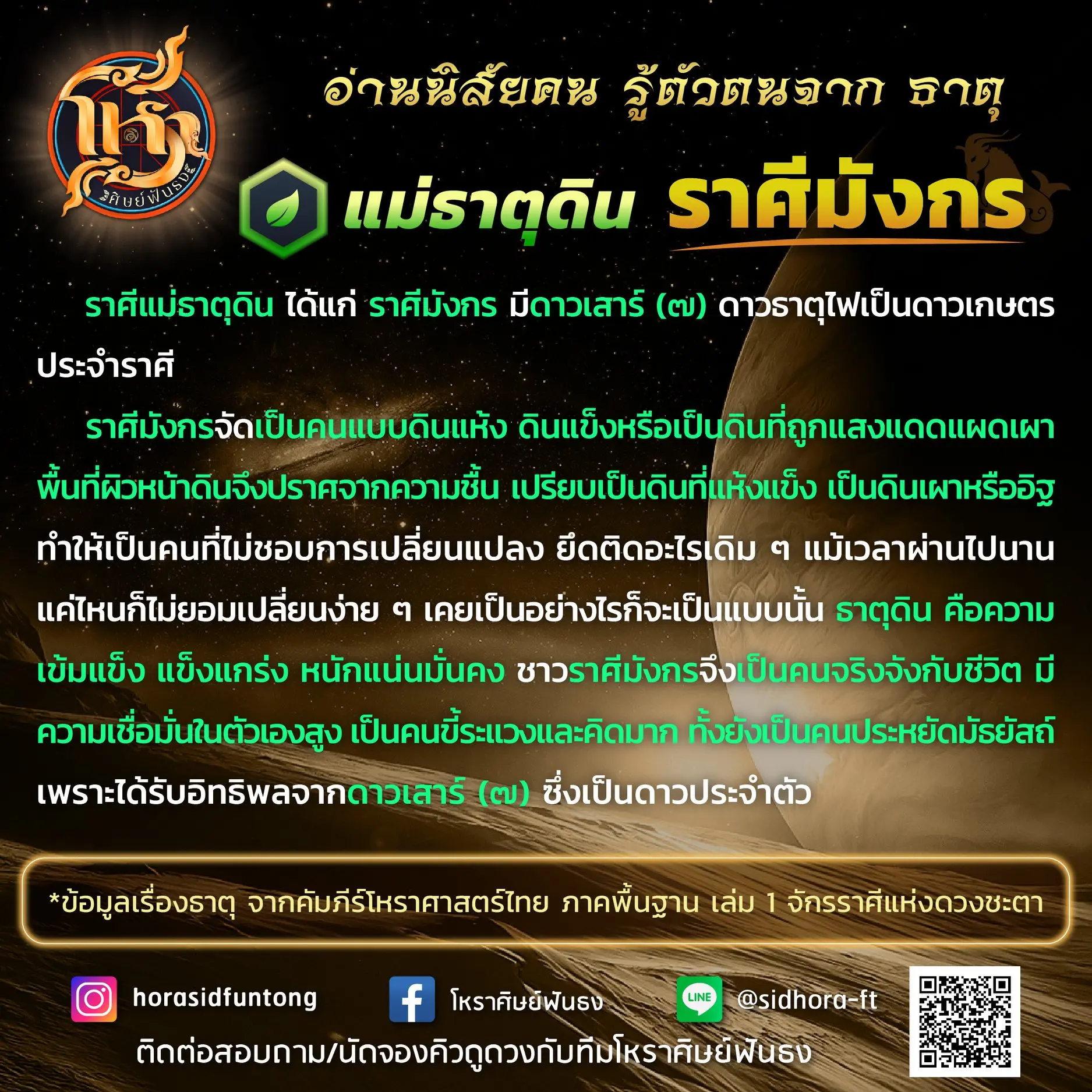 เพจโหราศิษย์ฟันธง ได้โพสต์ภาพและข้อความถึงคำทำนายนิสัยจากแม่ธาตุดิน ราศีมังกร ว่า “เราได้ทำความรู้จักลักษณะนิสัยของคนตามธาตุทั้ง 4 กันไปแล้ว แต่ในธาตุต่าง ๆ ยังสามารถแบ่งย่อยออกเป็น แม่ธาตุ กลางธาตุ และปลายธาตุ แตกต่างกันอย่างไร ต้องติดตามอ่านกันค่ะ สำหรับวันนี้เรามาเริ่มที่แม่ธาตุดินกันก่อน”