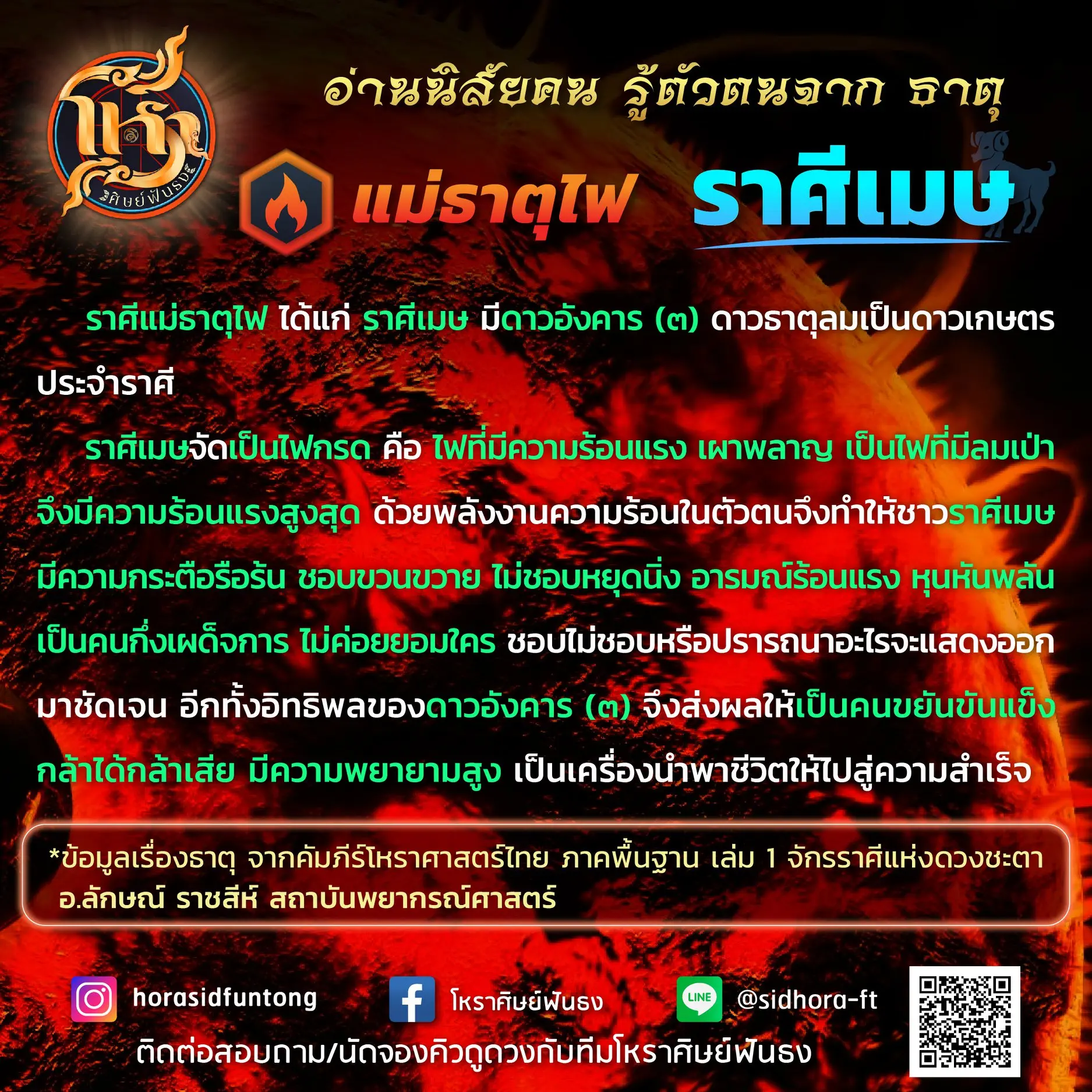 เพจโหราศิษย์ฟันธง ได้โพสต์ภาพและข้อความถึงคำทำนายนิสัยจากแม่ธาตุไฟ ราศีเมษ ว่า “สวัสดีค่ะ วันนี้ก็ถึงคิวของธาตุไฟแล้ว เรามาทำความรู้จักกับลักษณะนิสัยของราศีแม่ธาตุไฟกันก่อนเลยค่ะ”