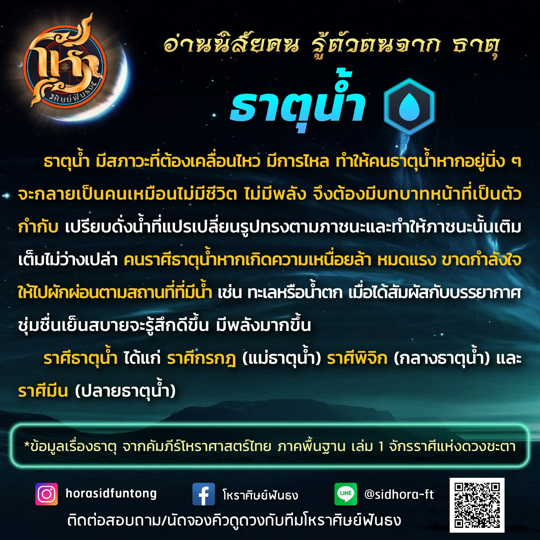 เพจโหราศิษย์ฟันธง ได้โพสต์ภาพและข้อความถึงคำทำนายนิสัยจาก ธาตุน้ำ ว่า “เช้านี้มาทำความรู้จักกับคนธาตุน้ำกันบ้างค่ะ ว่ามีลักษณะเด่นอย่างไรบ้าง และเกิดในลัคนา/ราศีอะไรบ้าง”