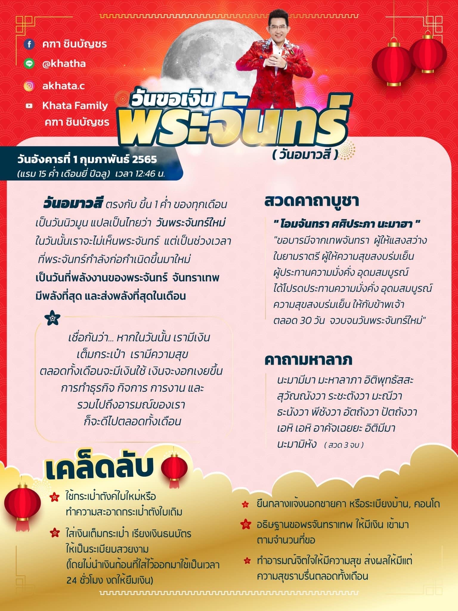 อาจารย์คฑา ชินบัญชร นักโหราศาสตร์ชื่อดังของเมืองไทย ได้โพสต์ ภาพและข้อความผ่านเพจเฟซบุ๊ก คฑา ชินบัญชร ว่า ห้ามพลาดรับพลังบวกเฮงยืนหนึ่งวันเดียวในรอบปี วันแรกของปีขาลวันชิวอิกและวันขอเงินพระจันทร์ วันอังคาร ที่ 1 กุมภาพันธ์ 2565