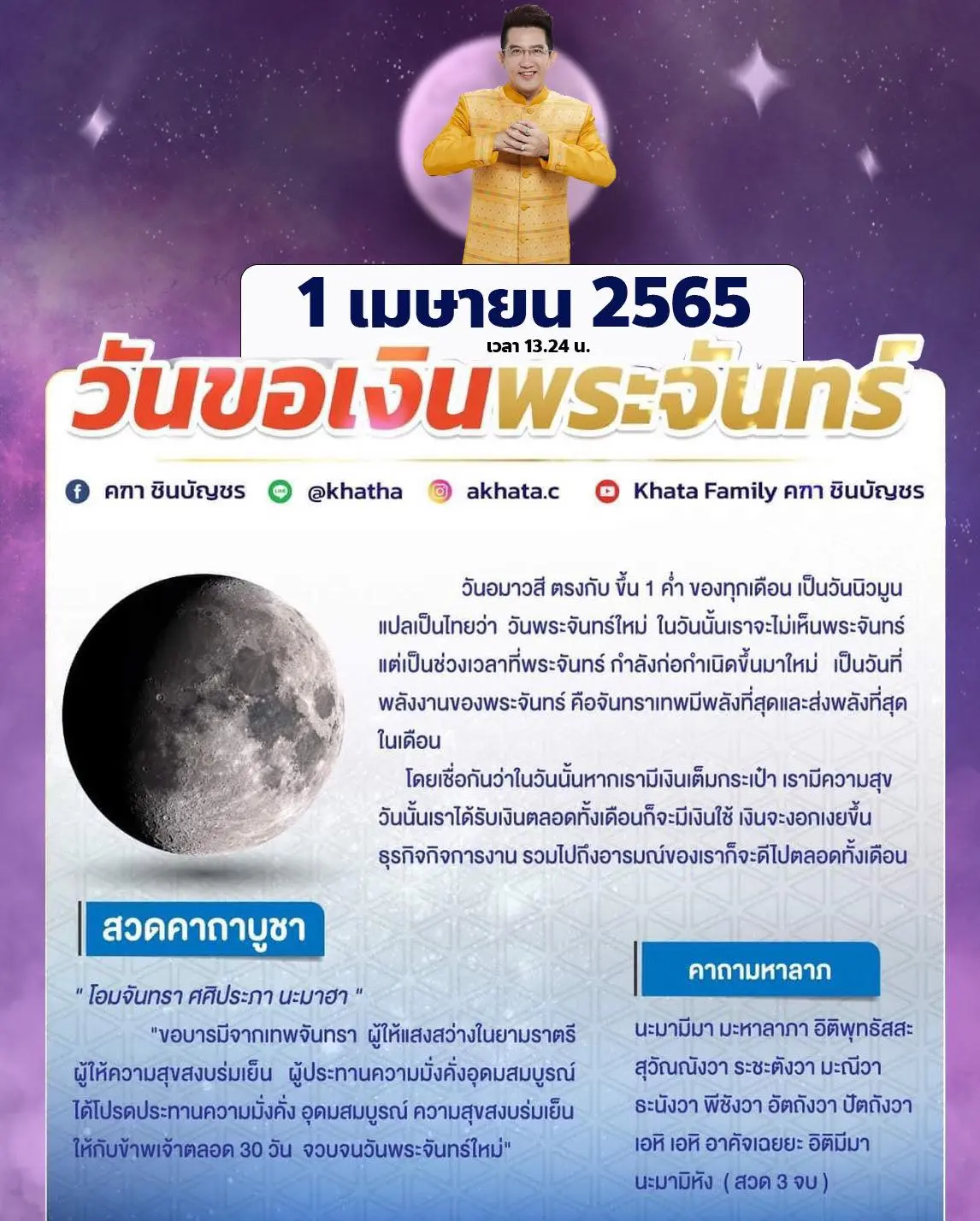 อาจารย์คฑา ชินบัญชร เผย คาถาสวดบูชาพระจันทร์ และ คาถามหาลาภ เนื่องใน วันขอเงินพระจันทร์ 1 เมษายน 2565 โดยได้โพสต์ผ่านทางแฟนเพจ คฑา ชินบัญชร