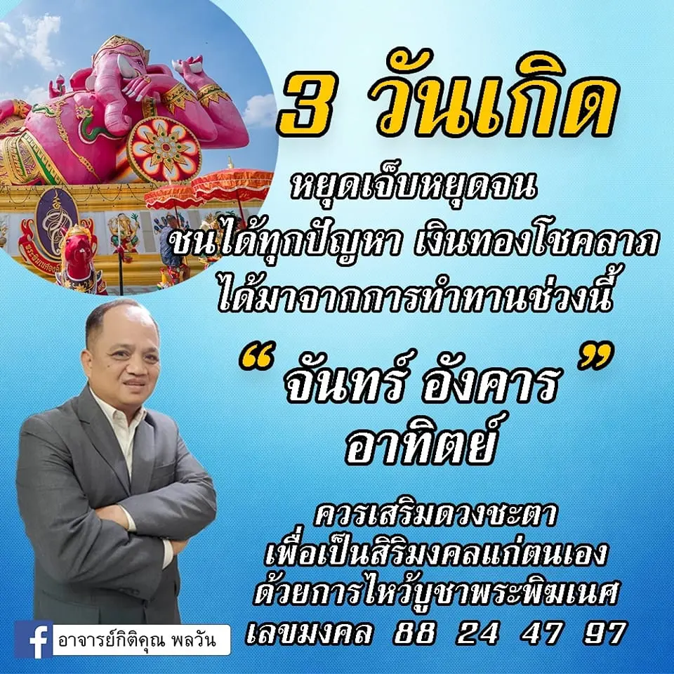 อาจารย์กิติคุณ พลวัน เผย ดวง 3 วันเกิด หยุดเจ็บหยุดจน ชีวิตเริ่มพบสิ่งดีๆ มีโชคลาภจากการทำทาน โดยได้โพสต์ผ่านแฟนเพจ อาจารย์กิติคุณ พลวัน