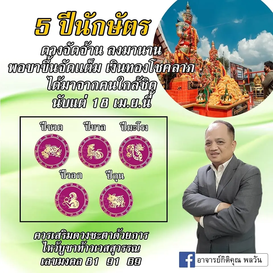 อาจารย์กิติคุณ พลวัน เผย ดวง 5 ปีนักษัตร จัดจ้าน ชีวิตอยู่ในช่วงขาขึ้น ทำให้โชคลาภเงินทองจัดเต็ม โดยได้โพสต์ผ่านแฟนเพจ อาจารย์กิติคุณ พลวัน