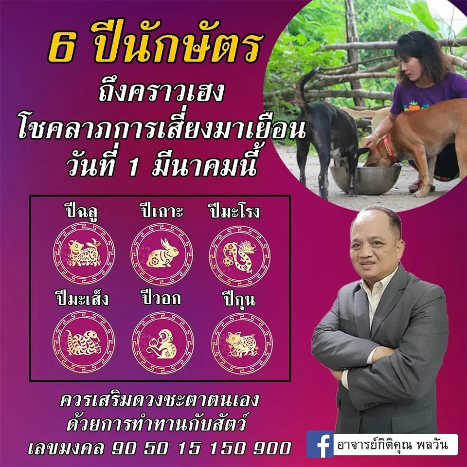 อาจารย์กิติคุณ พลวัน เลขาธิการสถาบันบ้านพยากรณ์ เผย ดวง 6 ปีนักษัตร มีเกณฑ์ถูกหวย รวยจากโชคลาภโดยได้โพสต์ผ่านแฟนเพจ อาจารย์กิติคุณ พลวัน