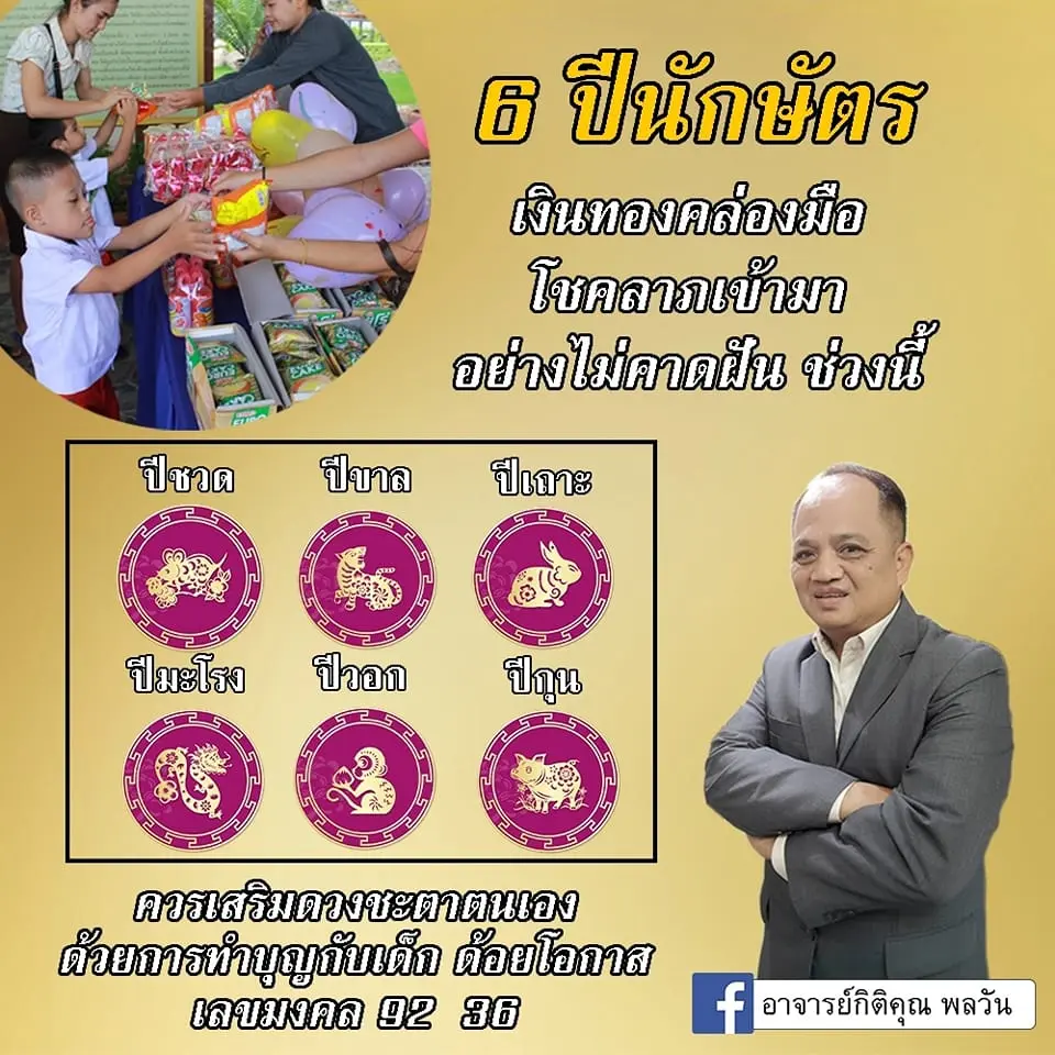 อาจารย์กิติคุณ พลวัน เลขาธิการสถาบันบ้านพยากรณ์ เผย ดวง 6 ปีนักษัตร เงินทองคล่องมือ โดยได้โพสต์ผ่านแฟนเพจ อาจารย์กิติคุณ พลวัน