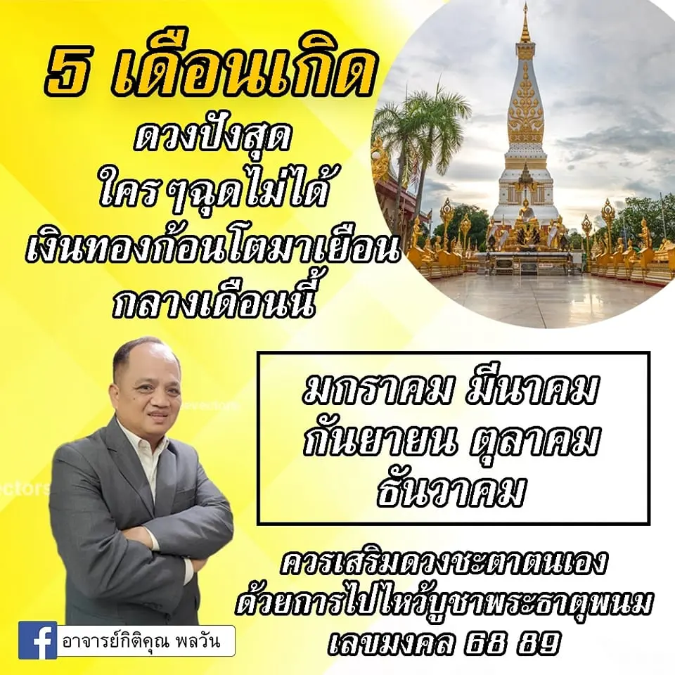 อาจารย์กิติคุณ พลวัน เลขาธิการสถาบันบ้านพยากรณ์ เผย ดวง 5 เดือนเกิด โชคลาภสุดปัง กลางเดือนนี้! โดยได้โพสต์ผ่านแฟนเพจ อาจารย์กิติคุณ พลวัน