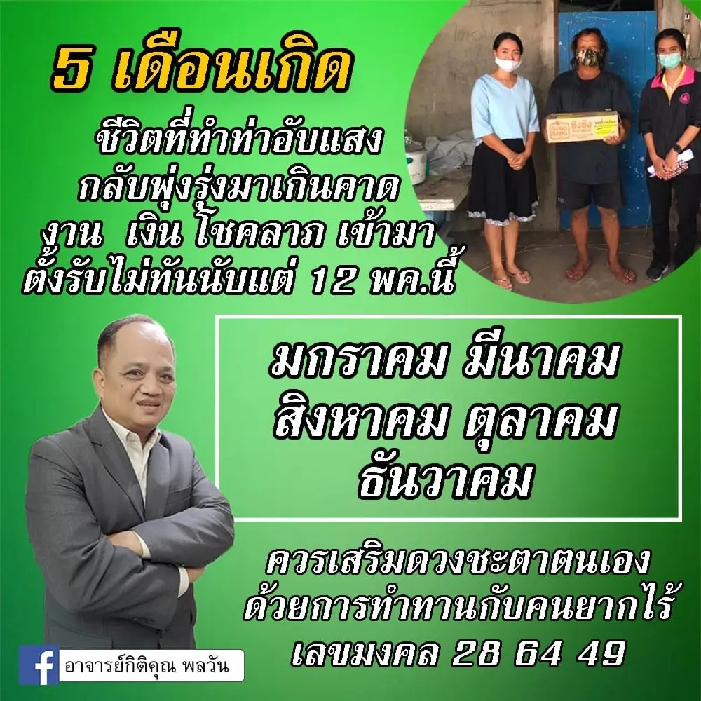 อาจารย์กิติคุณ พลวัน เผย ดวง 5 เดือนเกิด ชีวิตพุ่งแรง ชีวิตที่อับแสง จะกลับมารุ่งพุ่งเกินคาด โดยได้โพสต์ผ่านแฟนเพจ อาจารย์กิติคุณ พลวัน