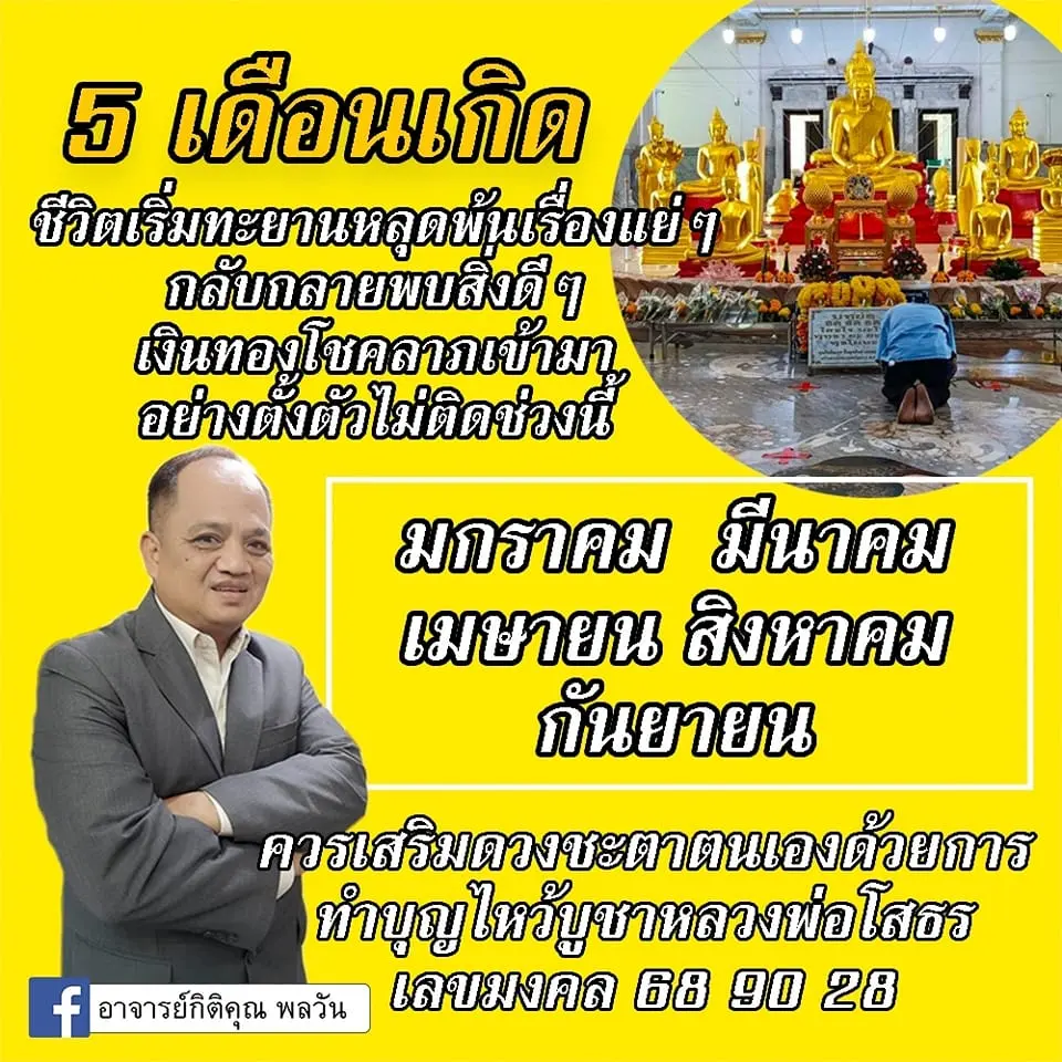 อาจารย์กิติคุณ พลวัน เผย ดวง 5 เดือนเกิด ติดสปีด ชีวิตดีขึ้นอย่างน่าพอใจ หลุดพ้นจากเรื่องแย่ๆ โดยได้โพสต์ผ่านแฟนเพจ อาจารย์กิติคุณ พลวัน