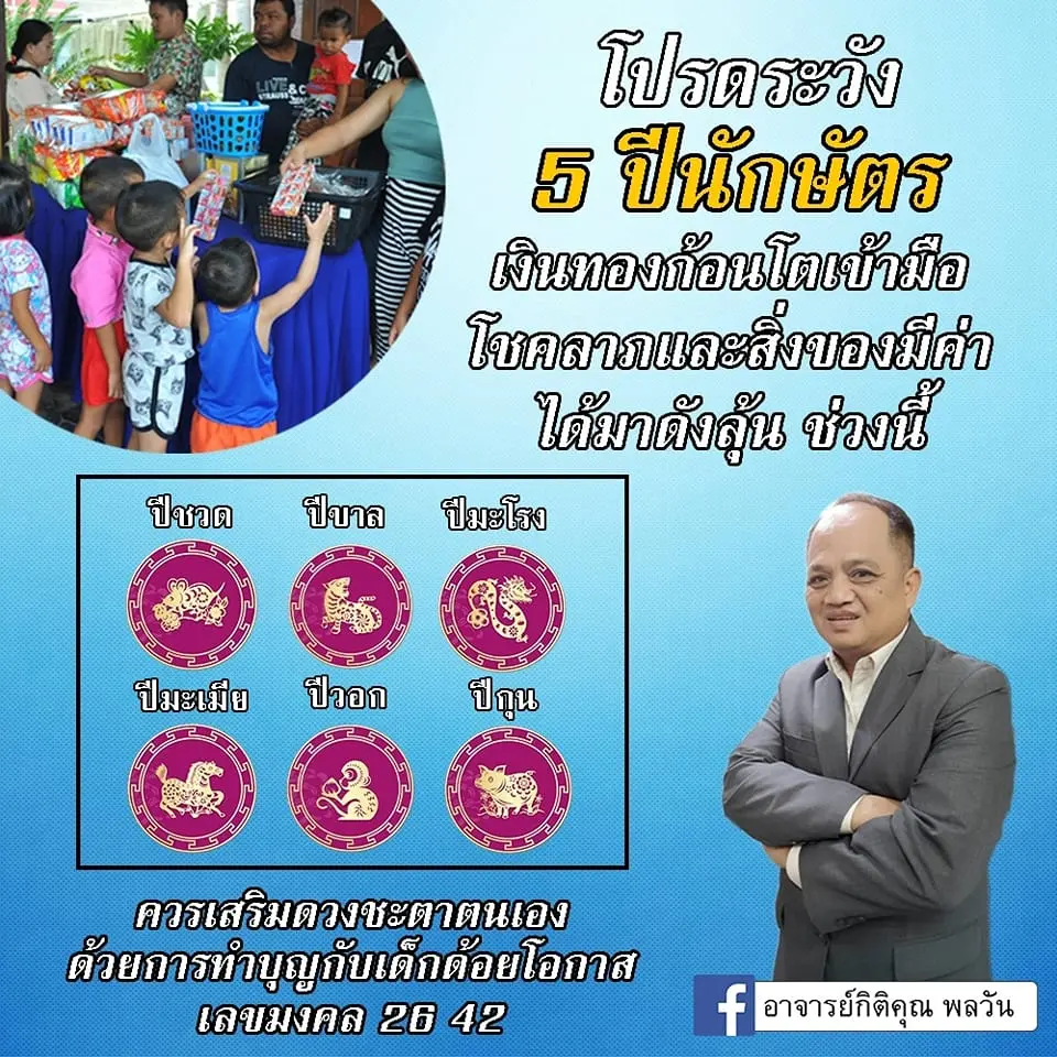 อาจารย์กิติคุณ พลวัน เลขาธิการสถาบันบ้านพยากรณ์ เผย 6 ปีนักษัตร ดวงถูกหวย มีเกณฑ์จะรวยจากโชคลาภ โดยได้โพสต์ผ่านแฟนเพจ อาจารย์กิติคุณ พลวัน