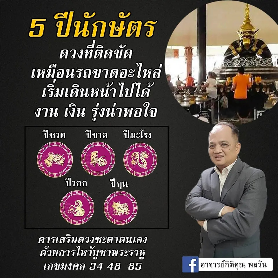อาจารย์กิติคุณ พลวัน เผย ดวง 5 ปีนักษัตร เงิน งานรุ่งเรือง ที่ผ่านมาติดขัด หลังจากนี้จะราบรื่น โดยได้โพสต์ผ่านแฟนเพจ อาจารย์กิติคุณ พลวัน