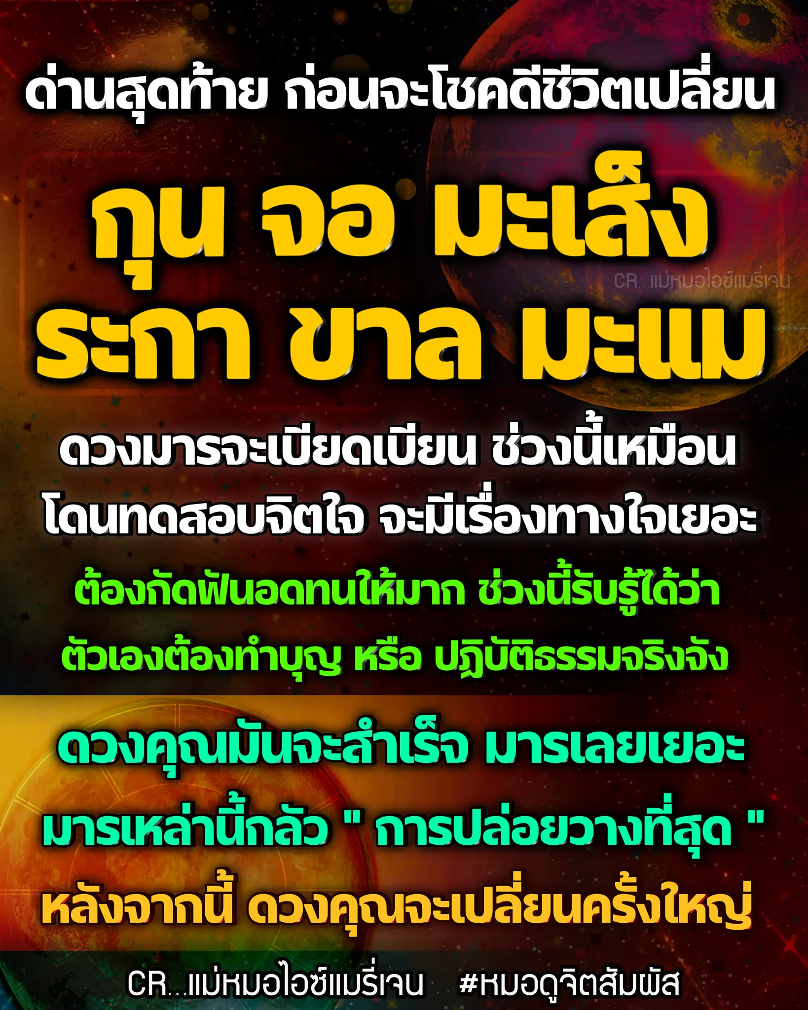 แม่หมอไอซ์แมรี่เจน เผย 6 ปีนักษัตร ดวงเปลี่ยนครั้งใหญ่ ขอให้อดทนกับอุปสรรคอีกนิด ก่อนชีวิตจะเปลี่ยนไป ได้โพสต์ผ่านแฟนเพจ แม่หมอไอซ์แมรี่เจน